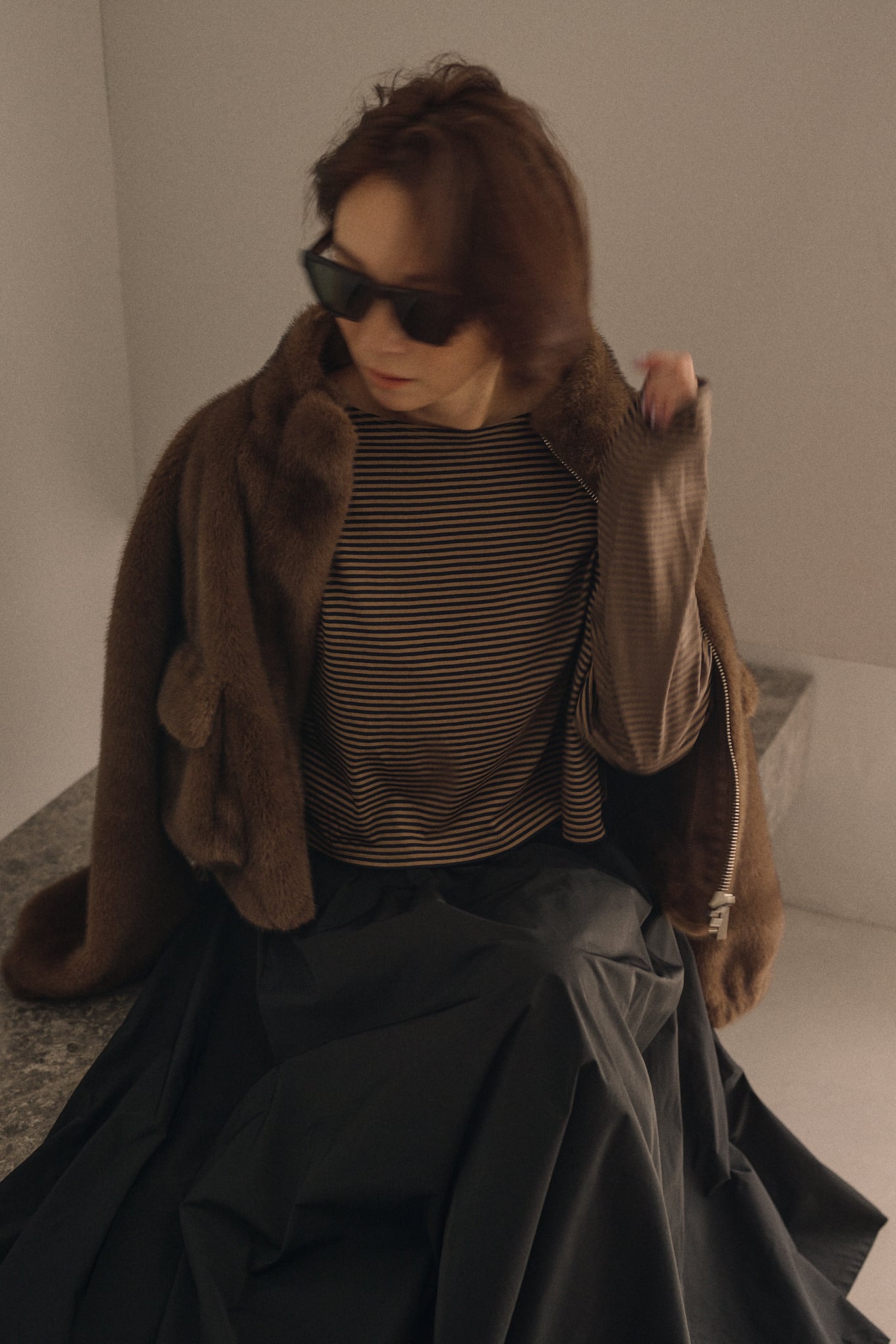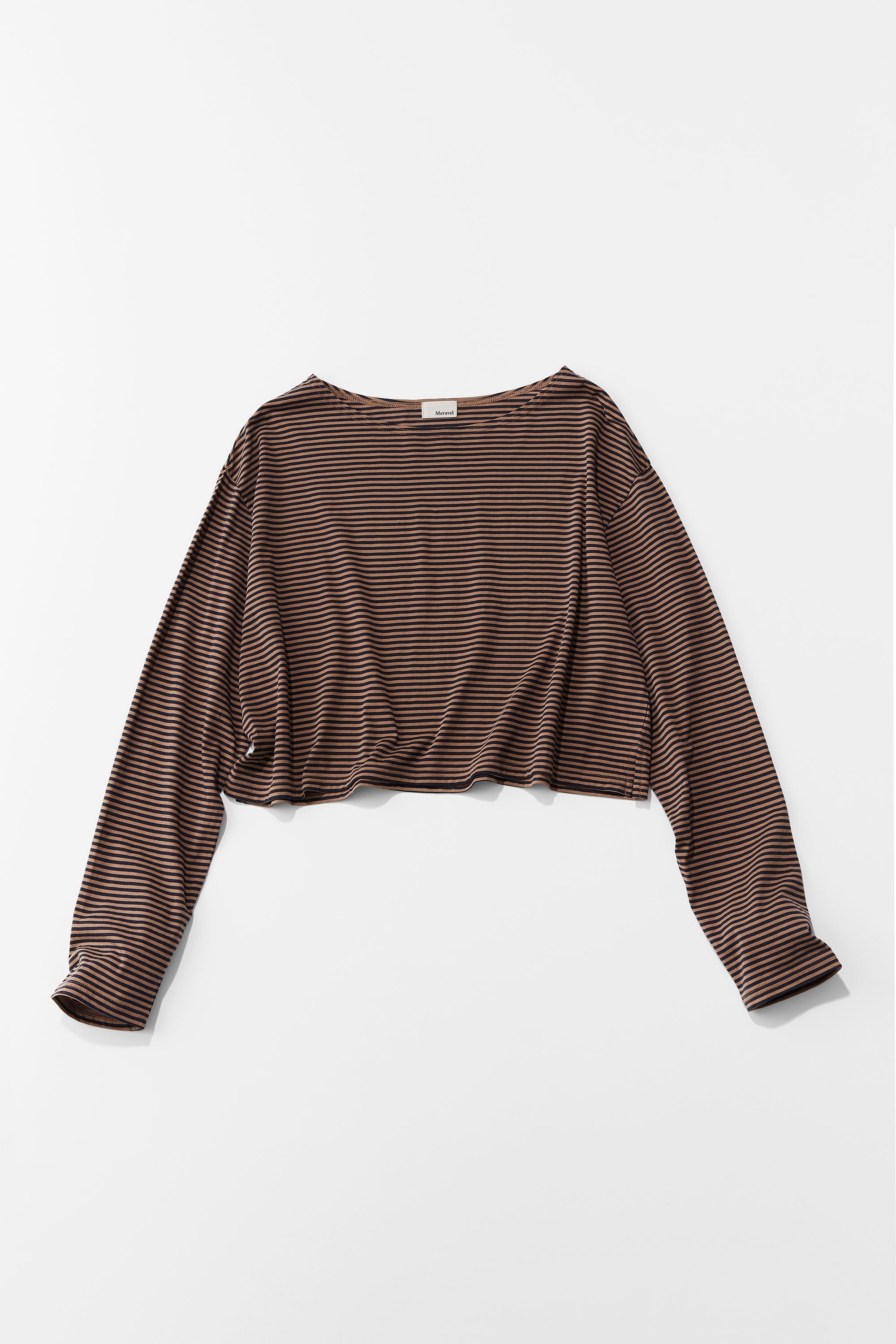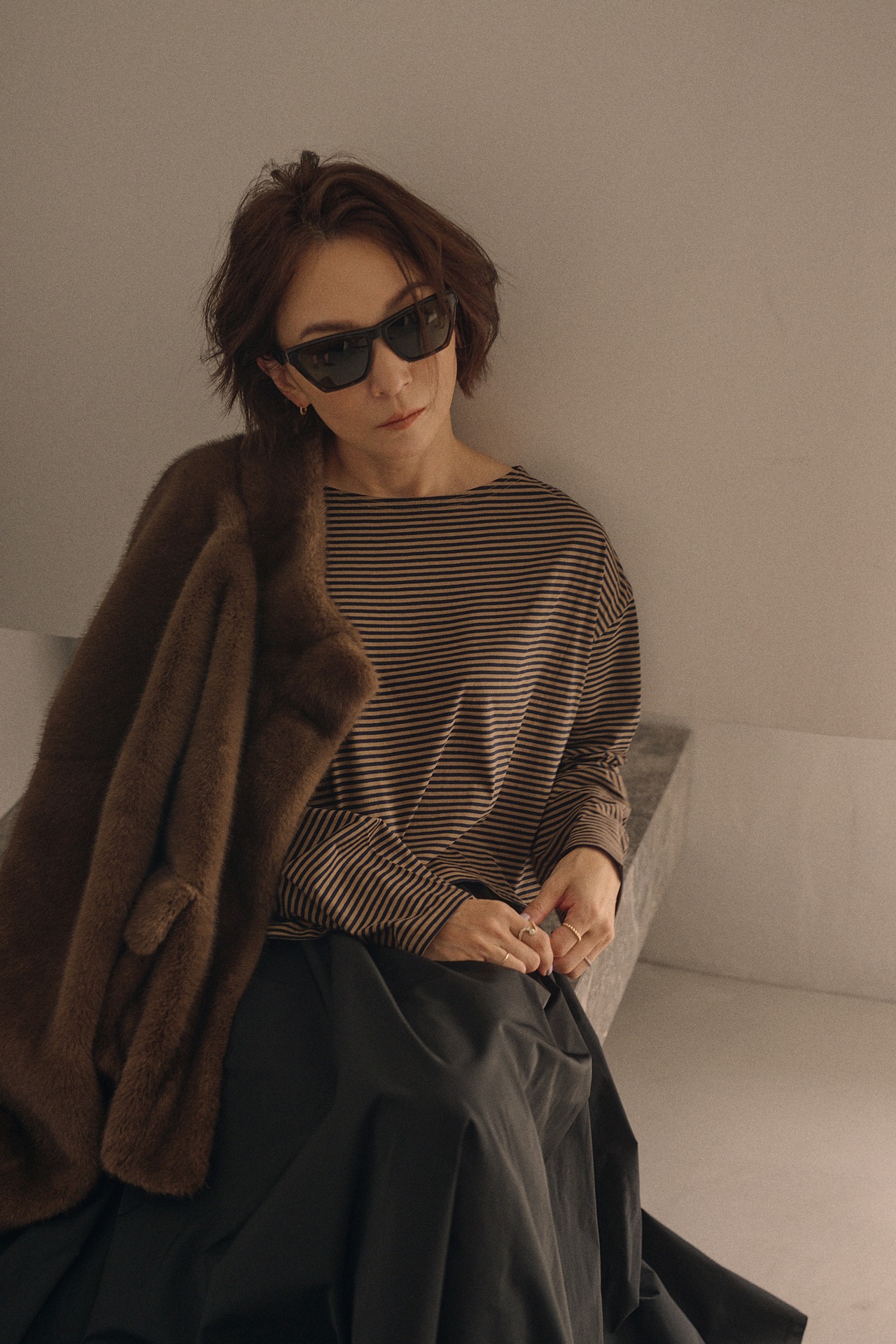 首周りがすっきり見えるボートネック、少しゆとりのある袖の太さ、大人でも着れる丈の短さ。