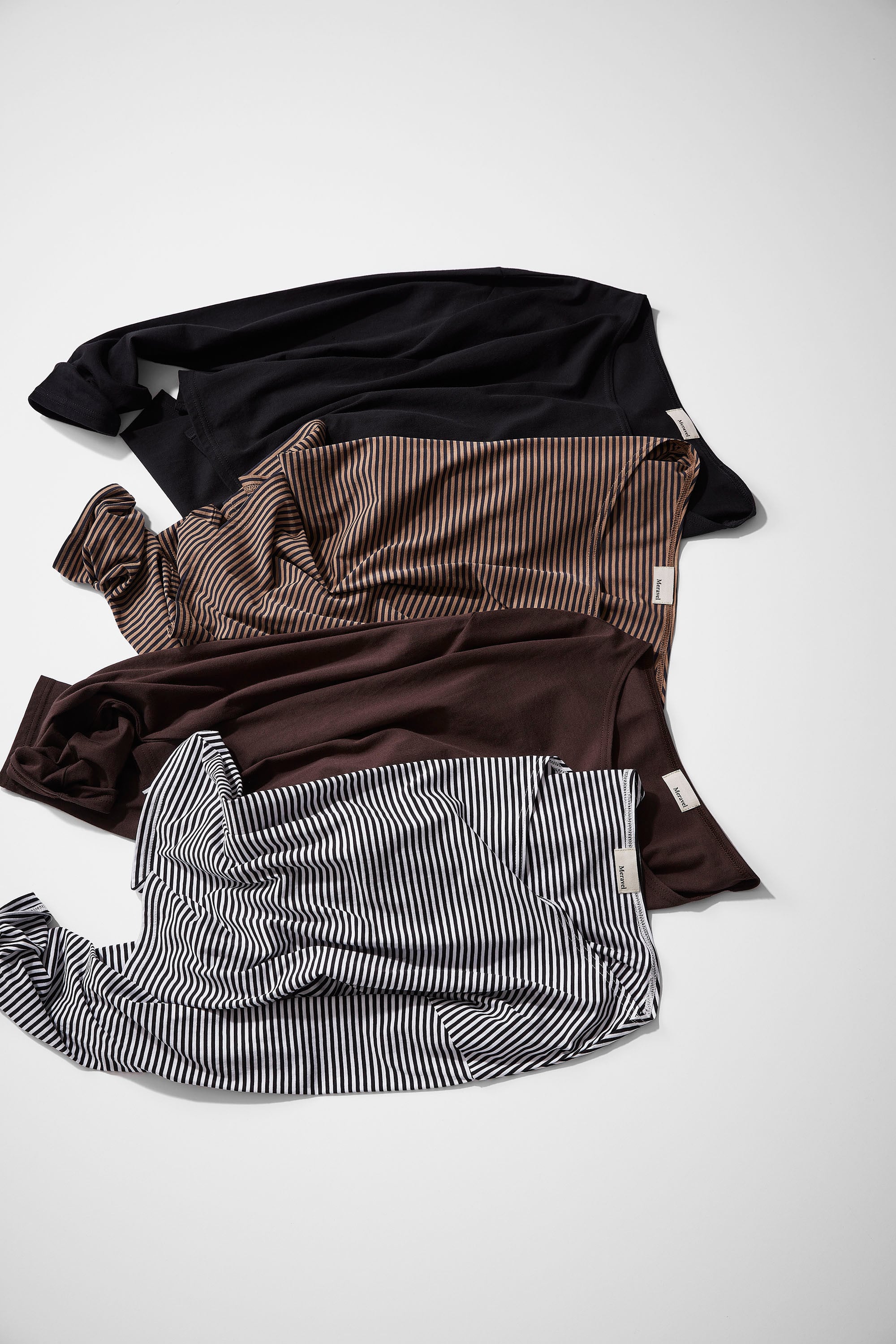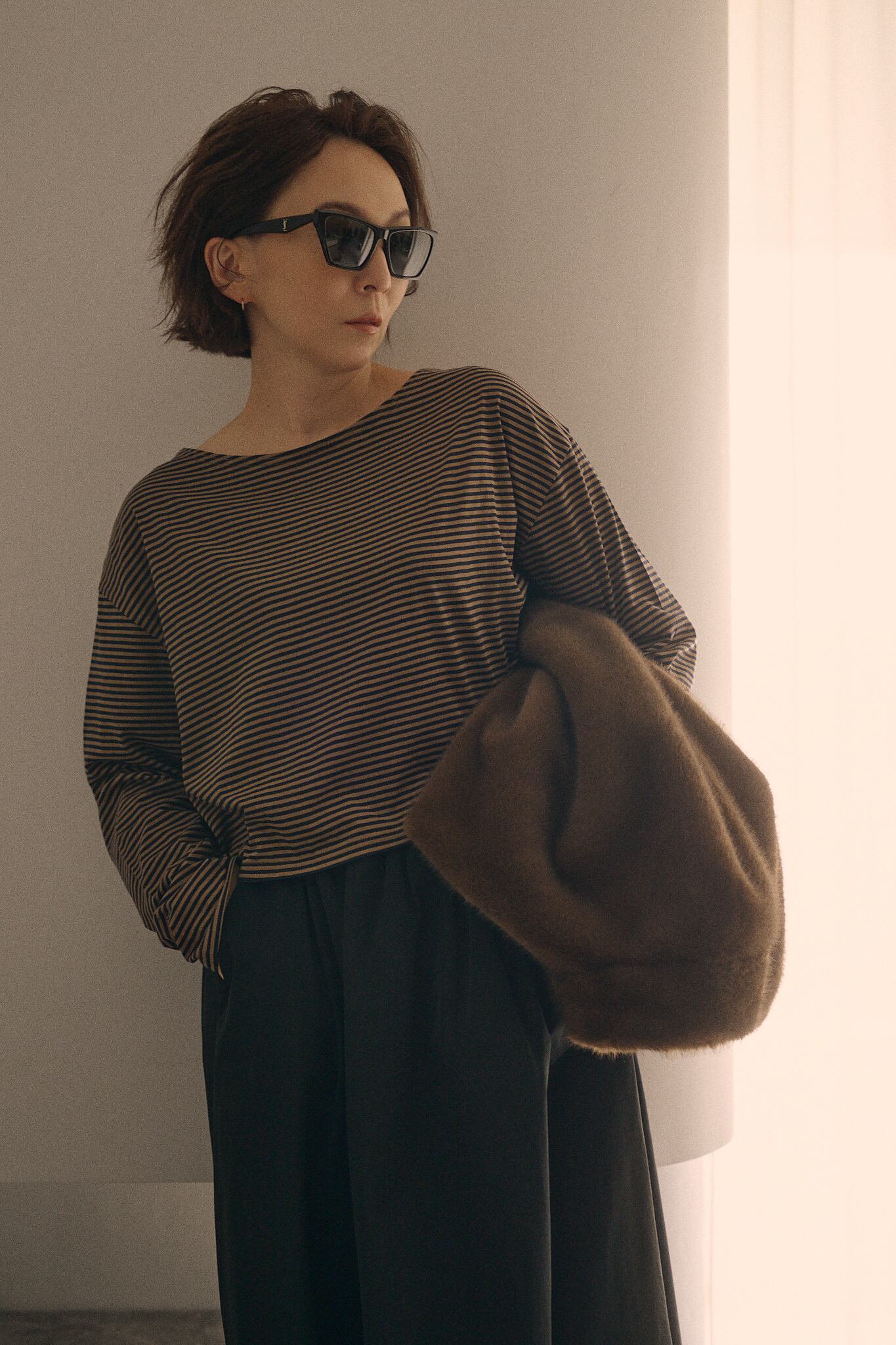 大人が着てもカジュアルすぎないように細いピッチのボーダー生地を使用。