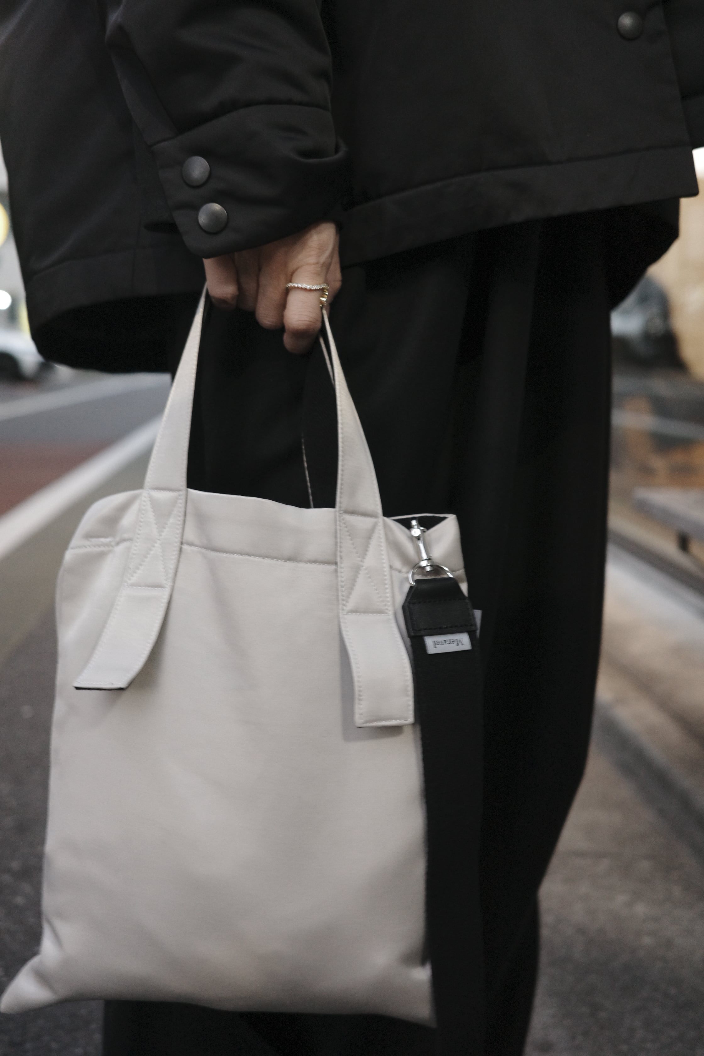 持ち手もワンハンドルのバッグなどと一緒に持てるような長さに調整。重くなった時や荷物が増えた時に肩にかけれるようなストラップを付属に。