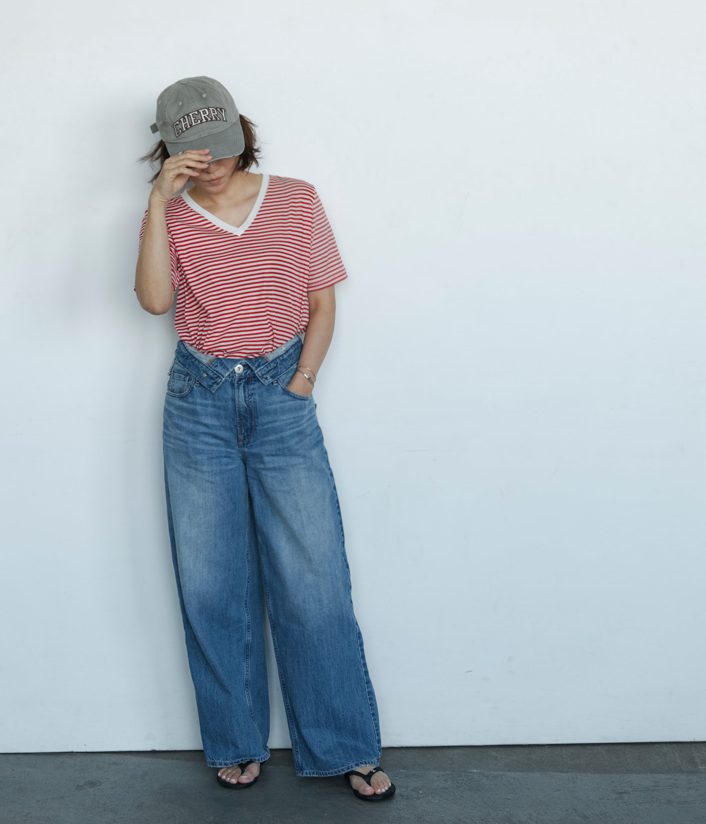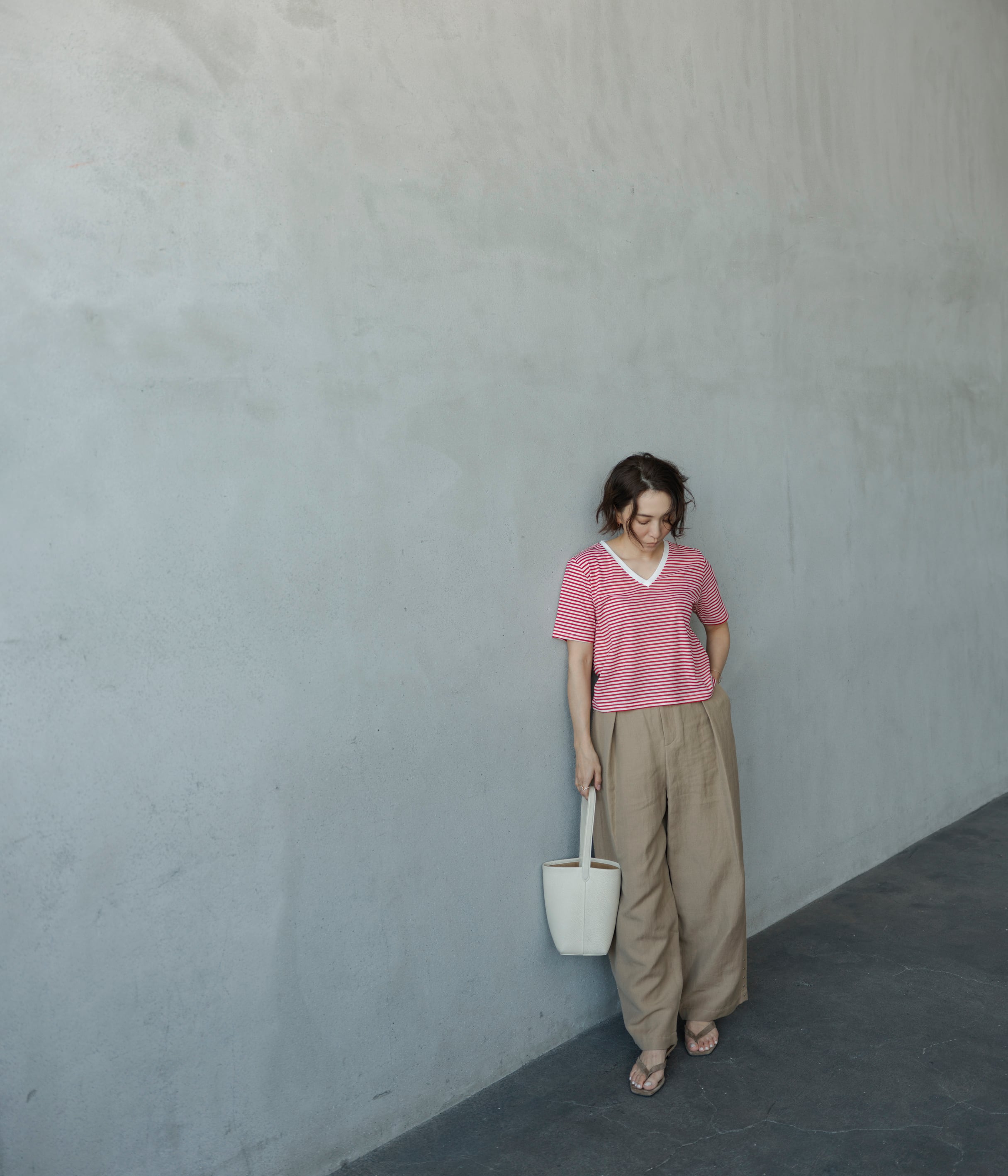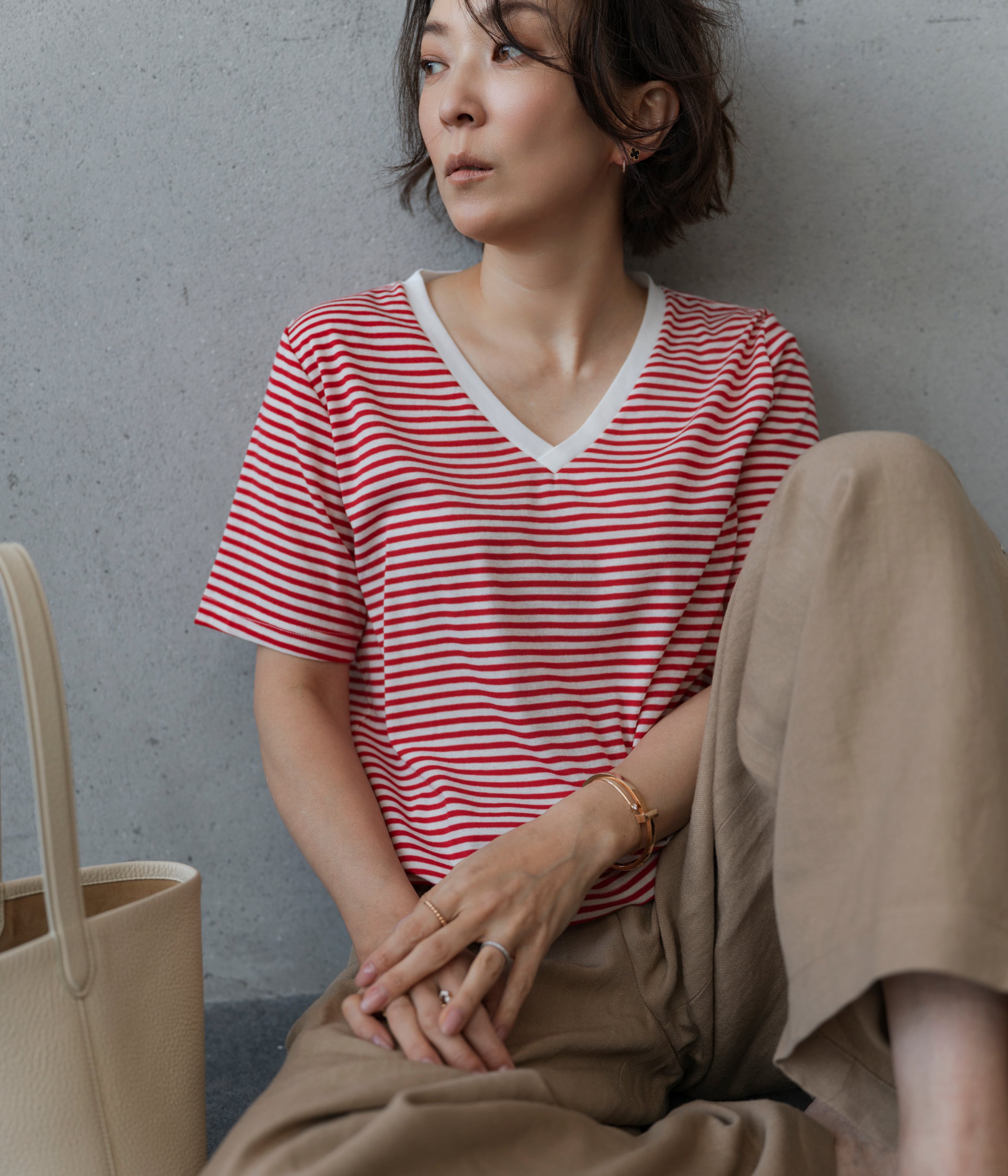 今回誕生したStriped V-neck Teeはパンツにもスカートにも合わせやすい丈感と