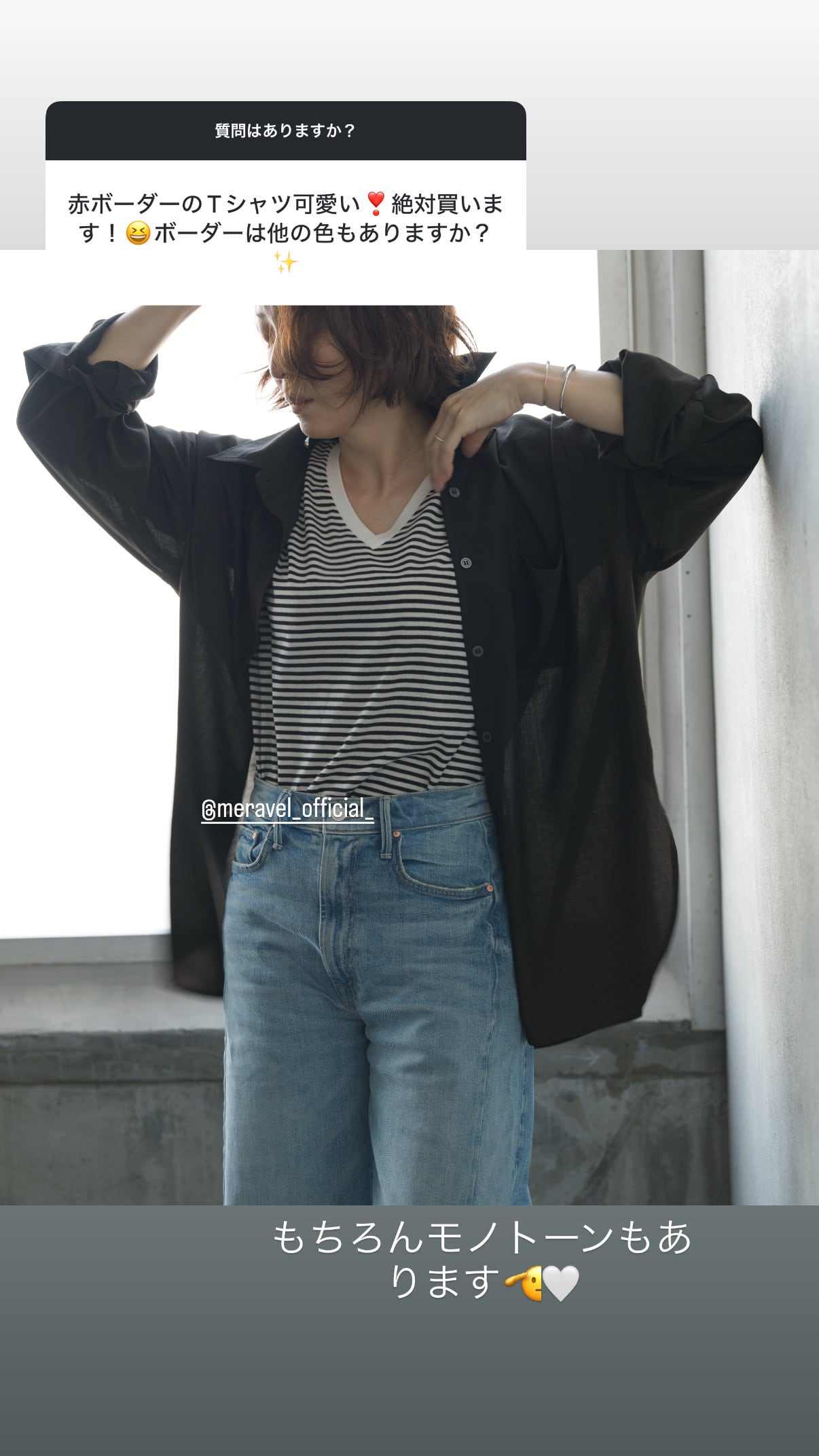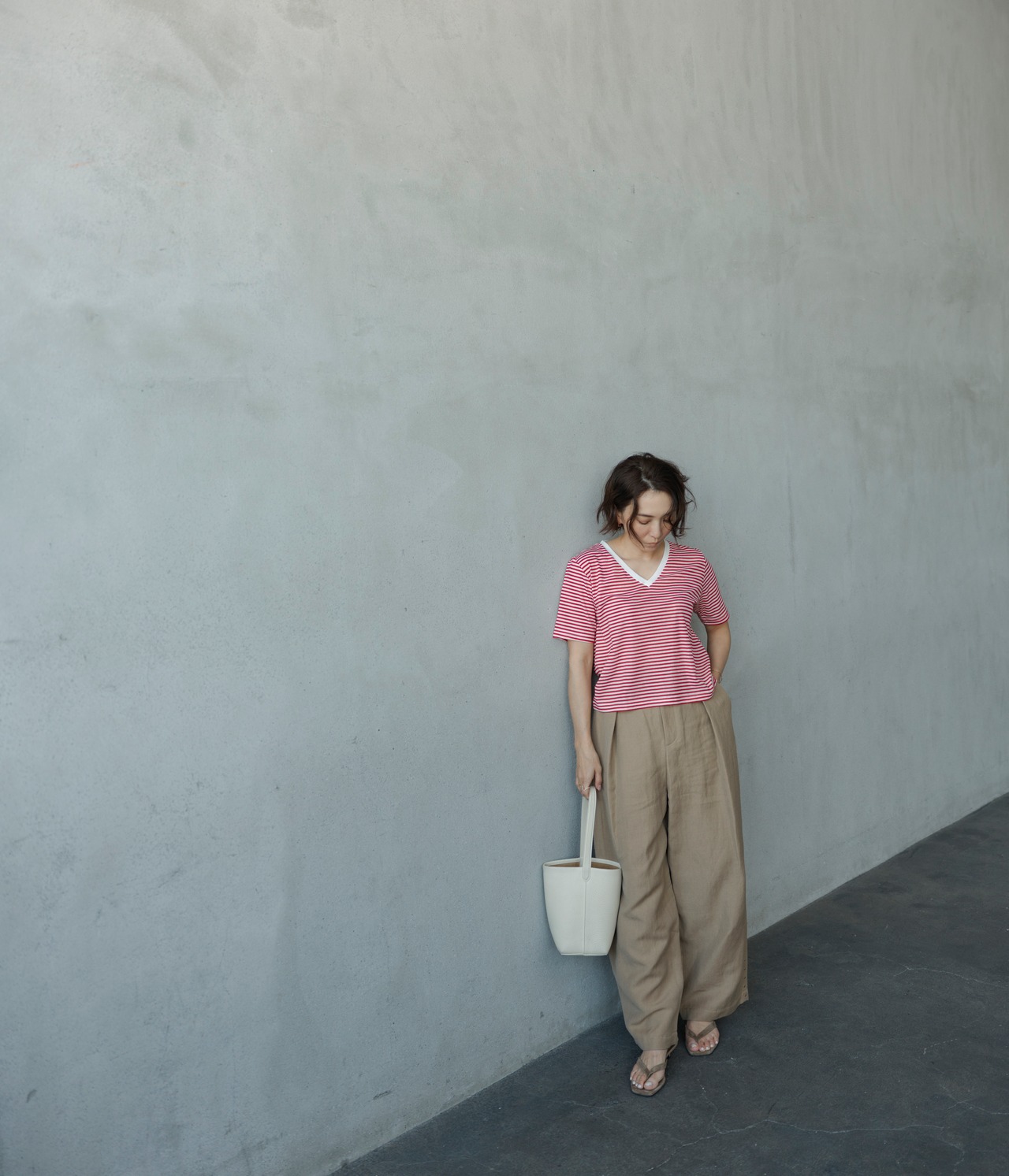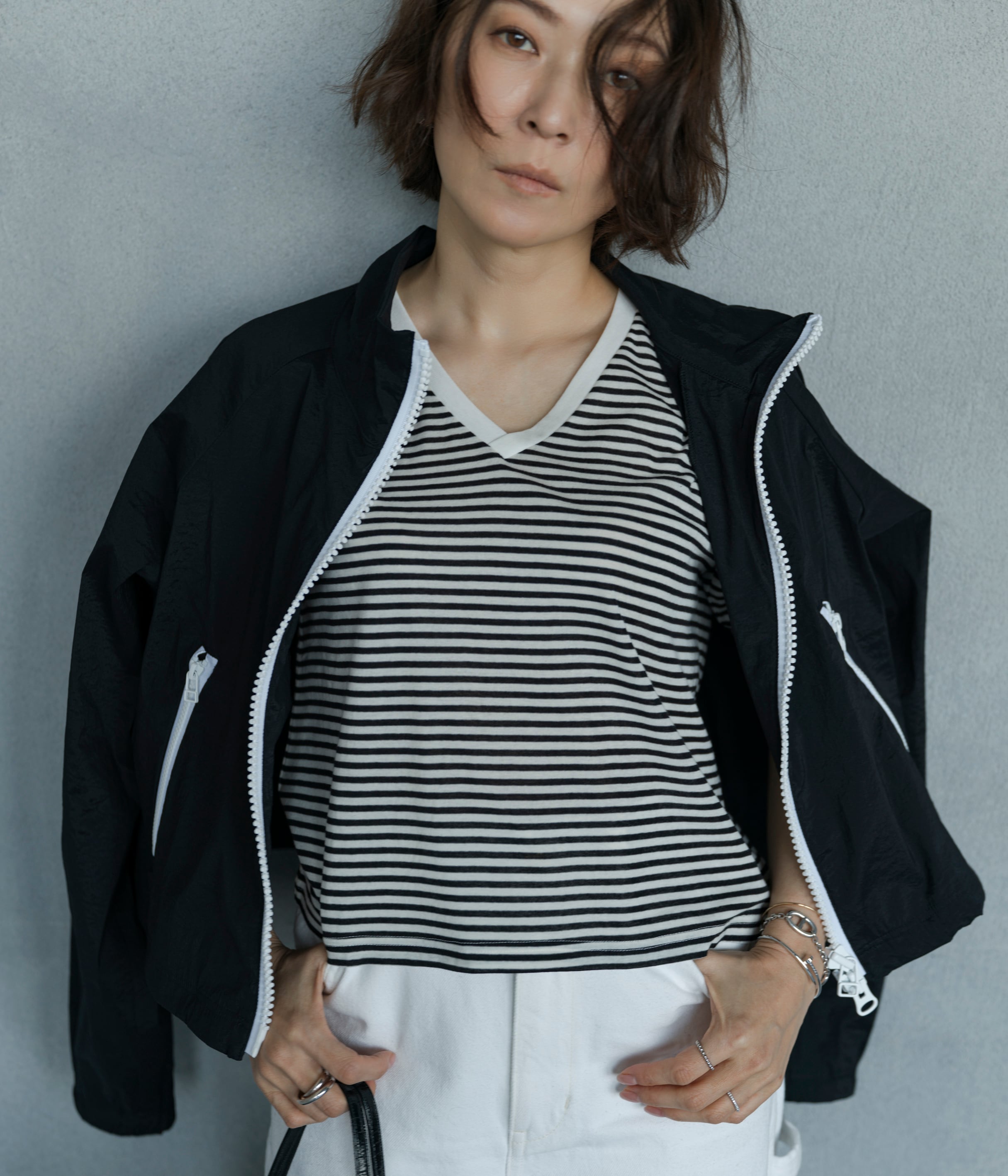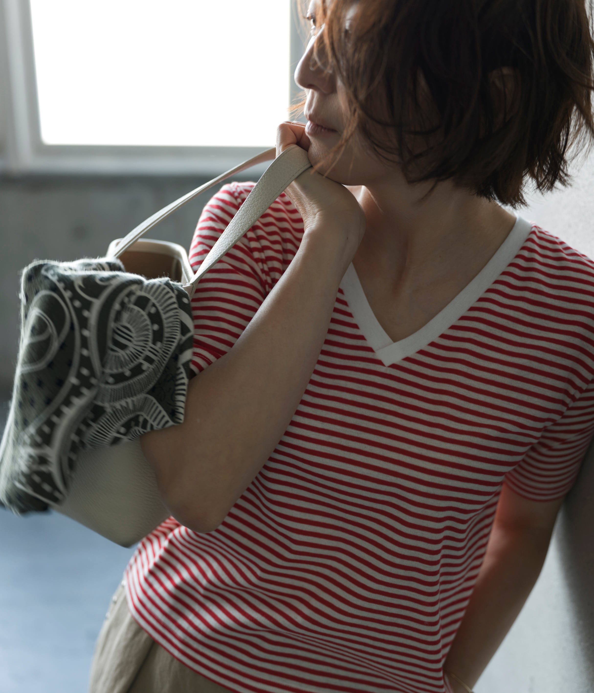 今回誕生したStriped V-neck Teeはパンツにもスカートにも合わせやすい丈感と