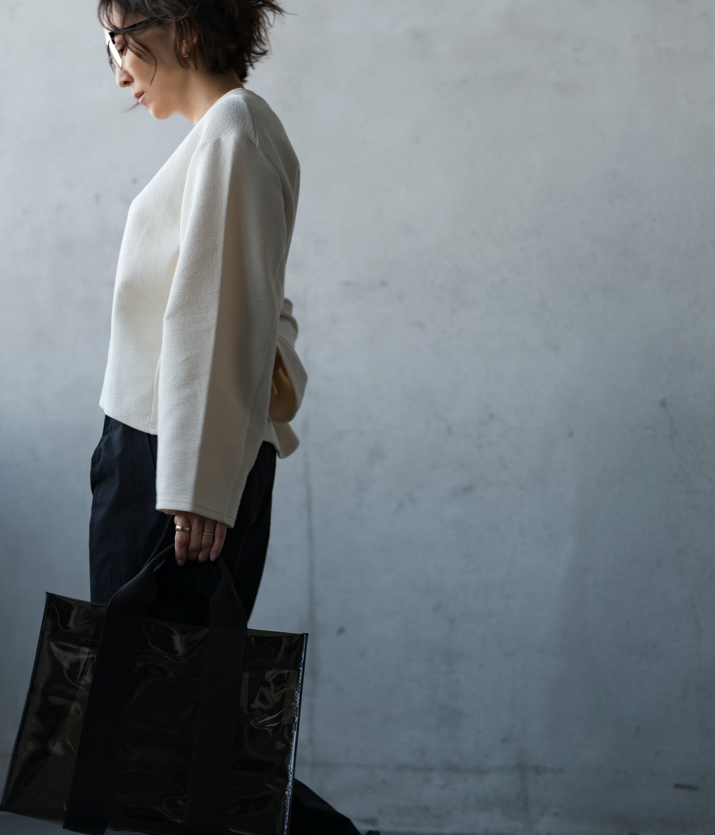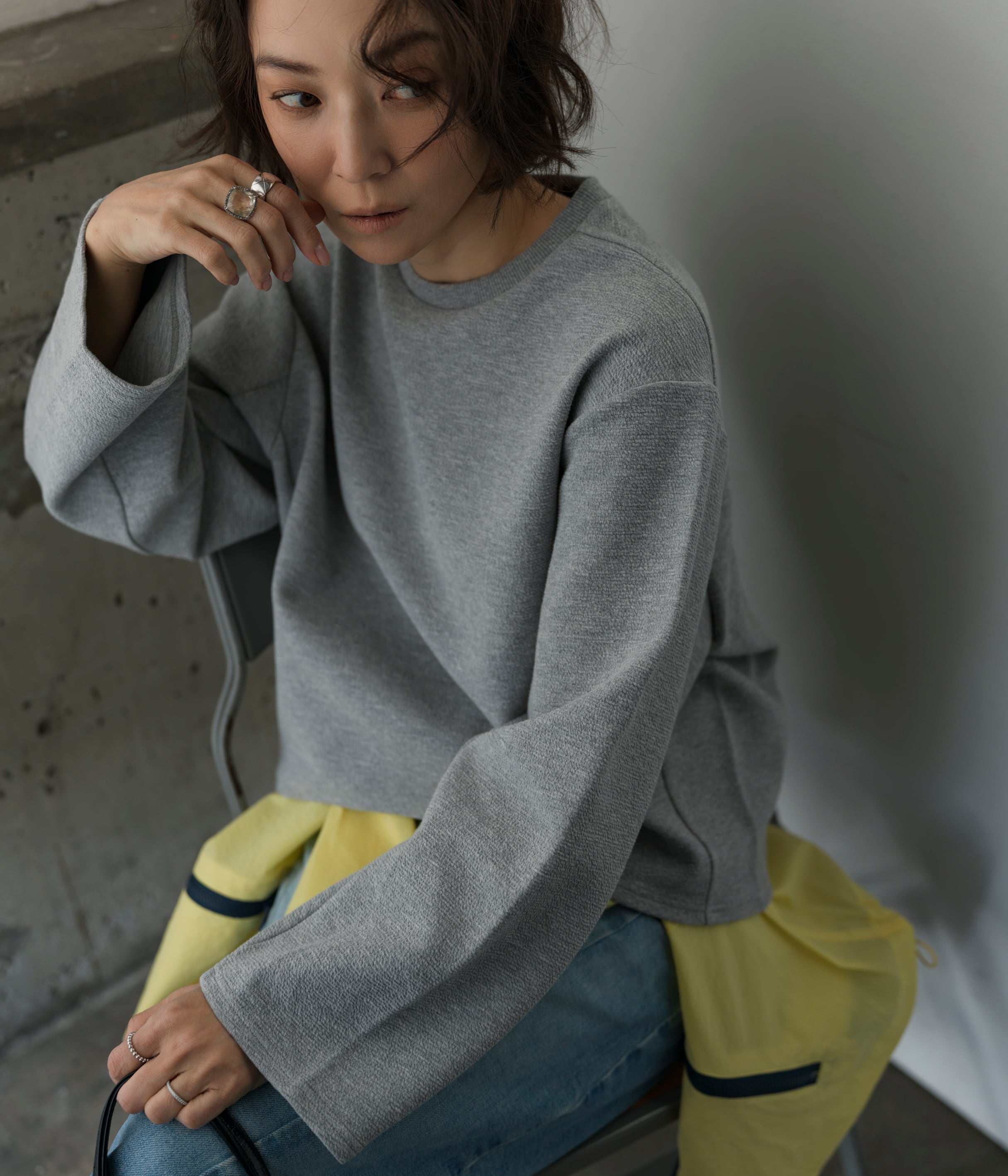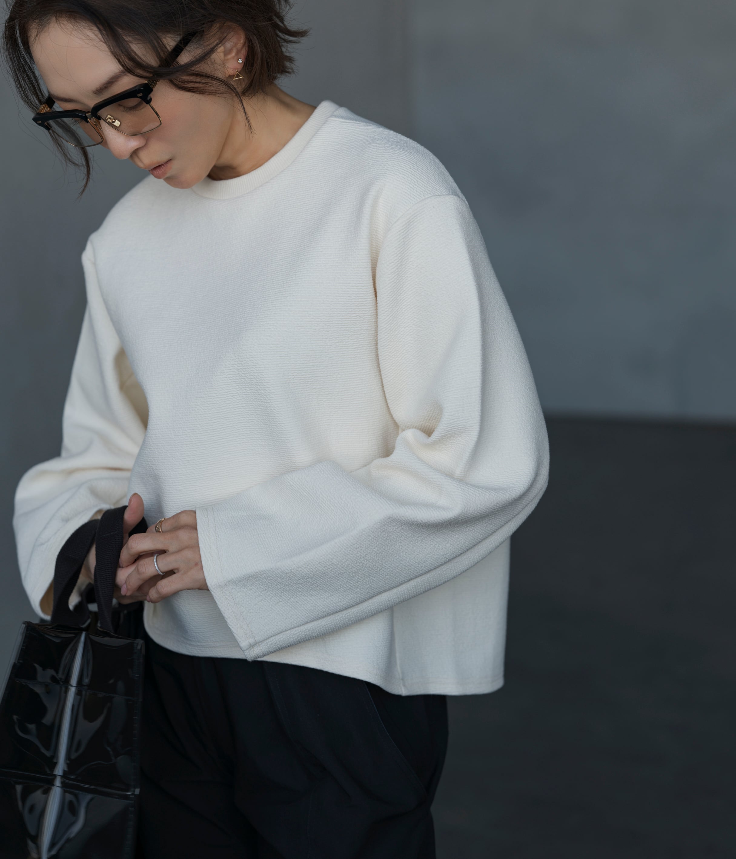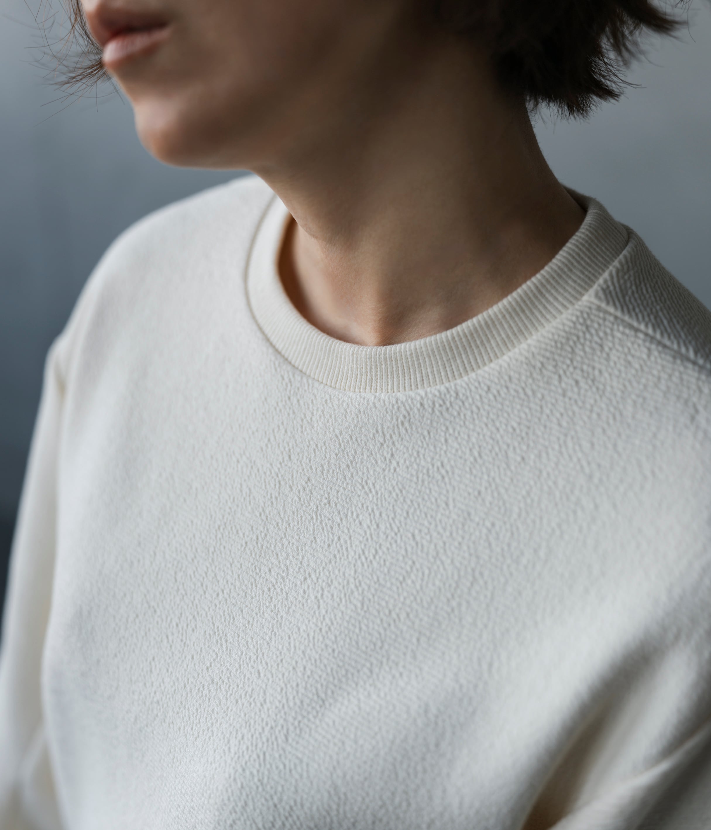 フィットし過ぎないけれどキレイめに見える身幅、詰まり過ぎないクルーネック、立体感のある袖、大人の悩みを解決してくれる着心地の良さが特徴。