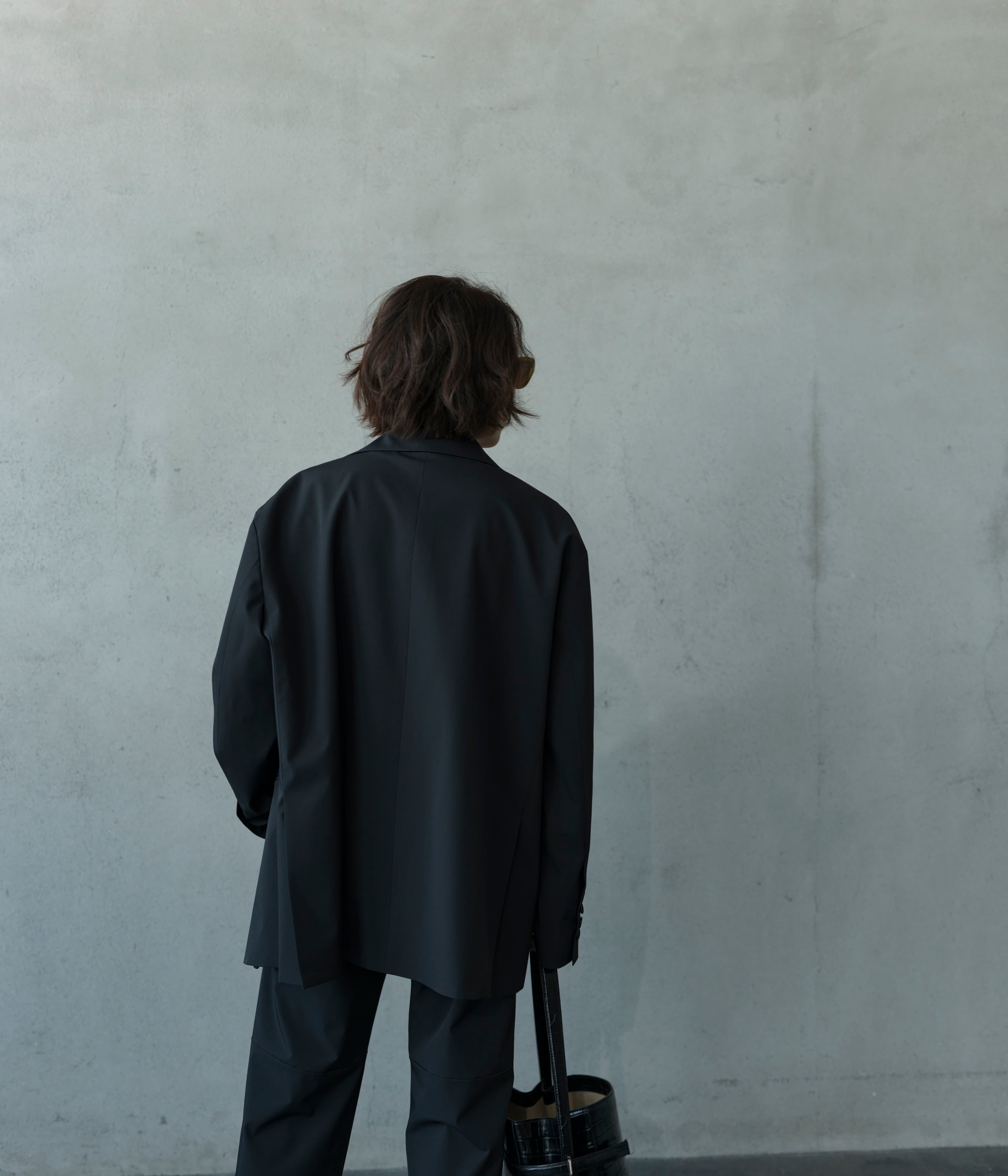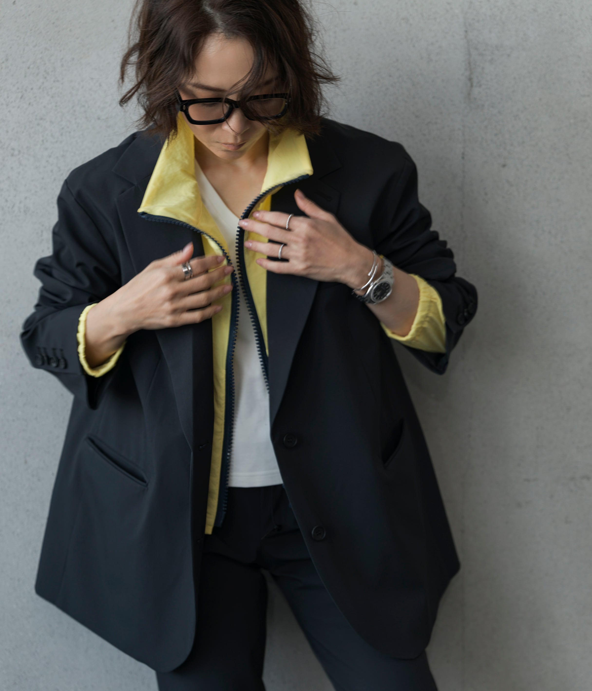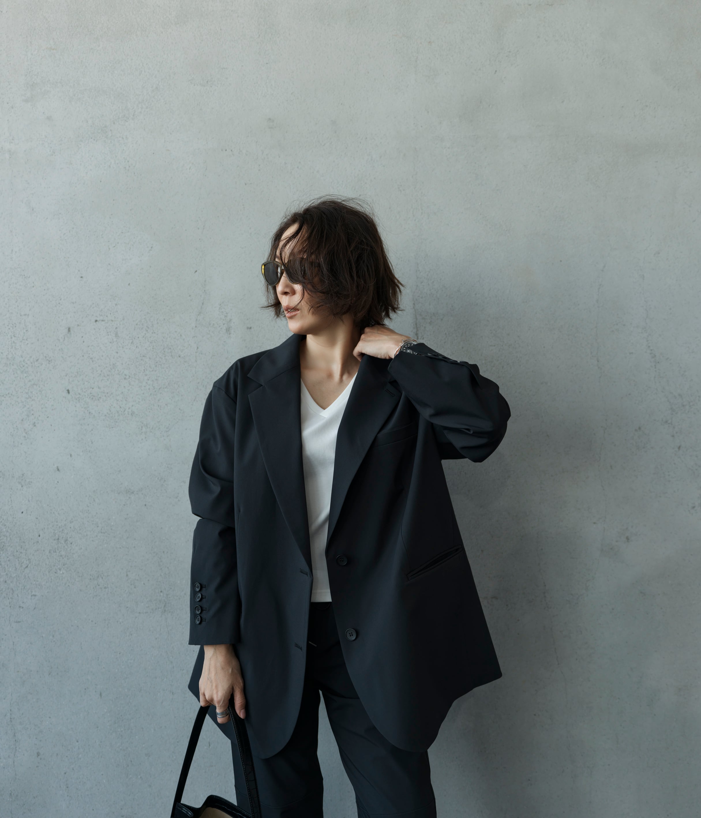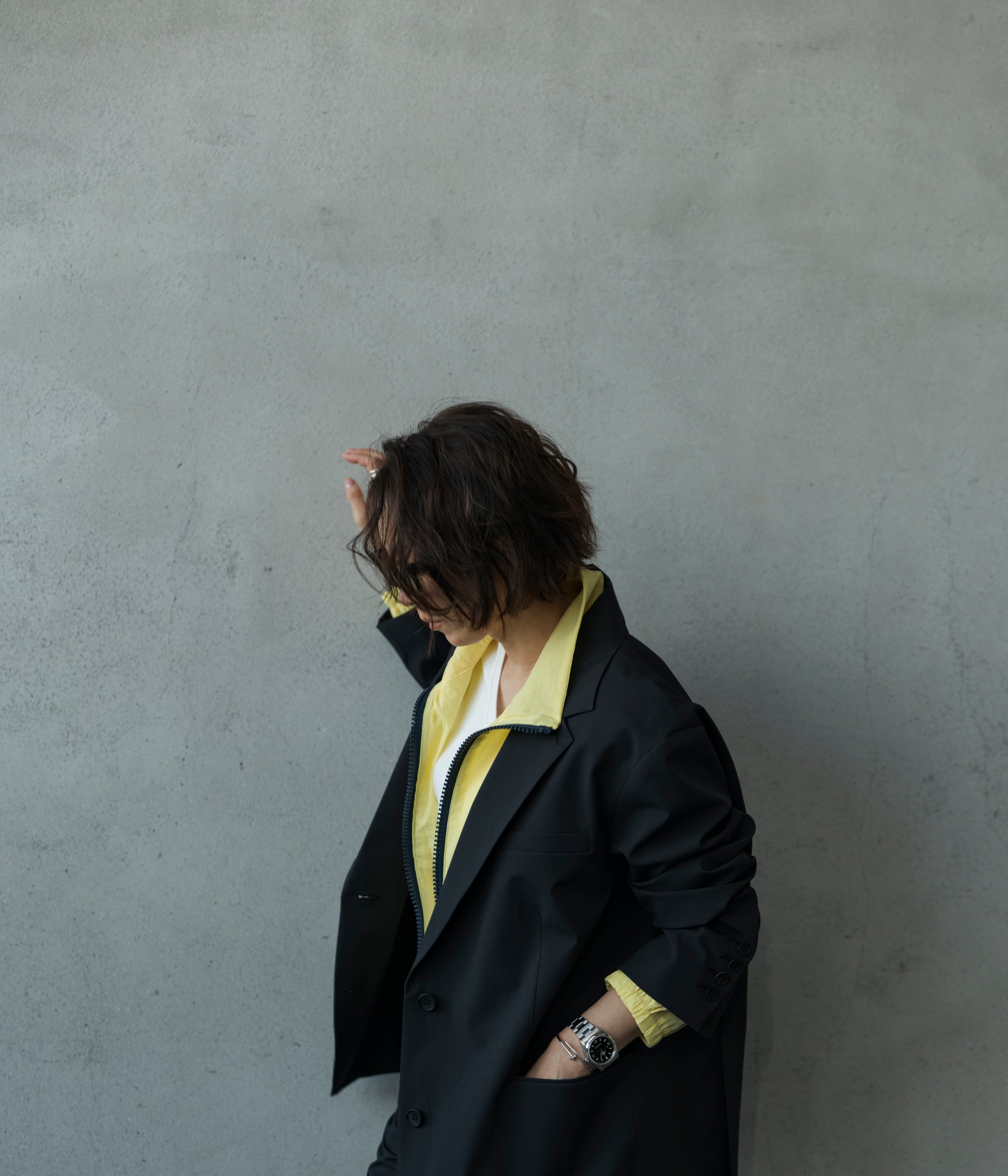 機能的には、2WAYストレッチ、接触冷感、UVカット、撥水、ウォッシャブルという多機能のお素材でお作りしているので、春コート代わりとしても、雨の日のアウターとしても大活躍するはず。ジャケットという見た目ですが、ビッグシルエットでカジュアルなファッションと合わせたり、ワンピースの上に羽織ったり、同素材でお作りしたパンツと合わせてセットアップで綺麗めに着ることも可能です。
