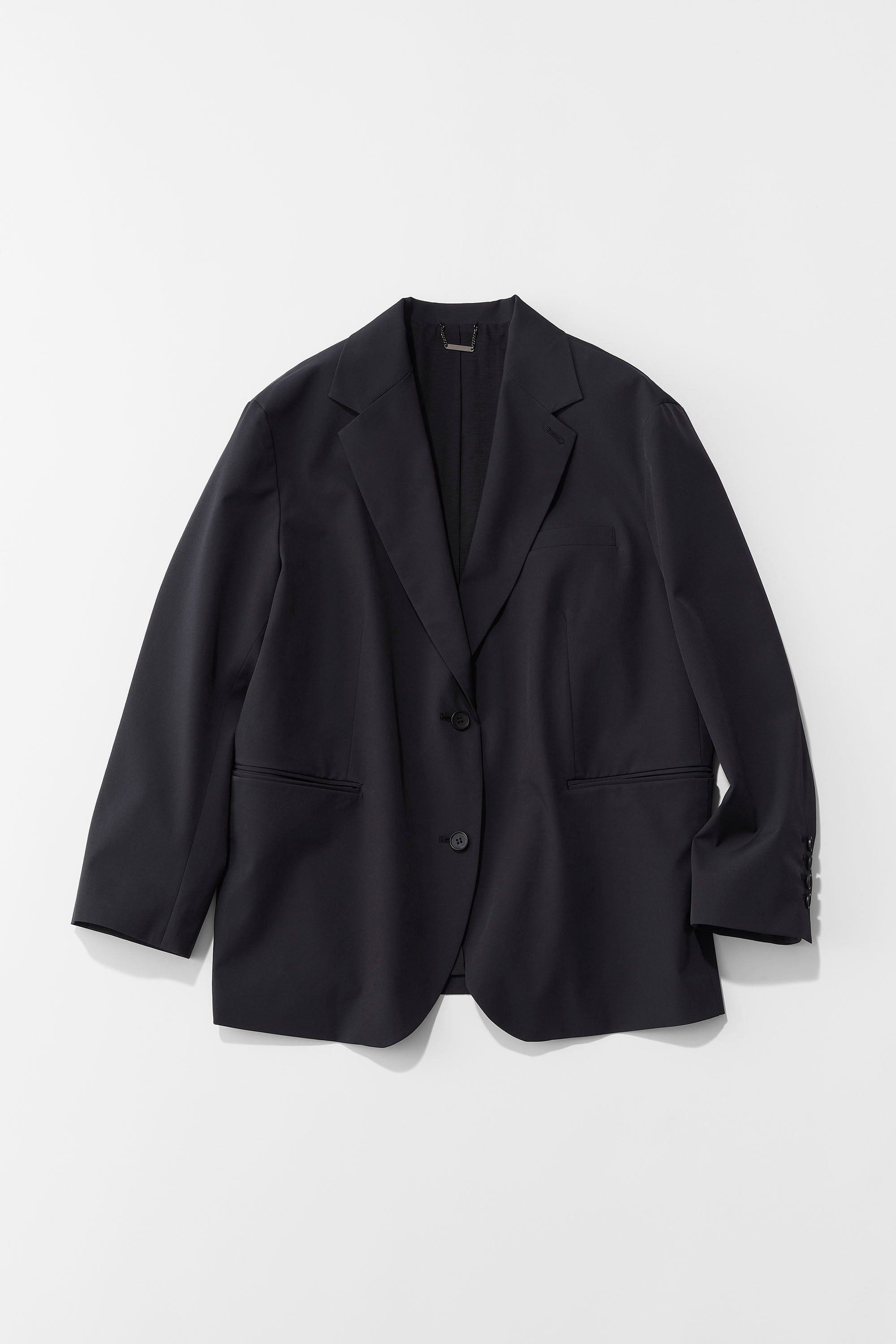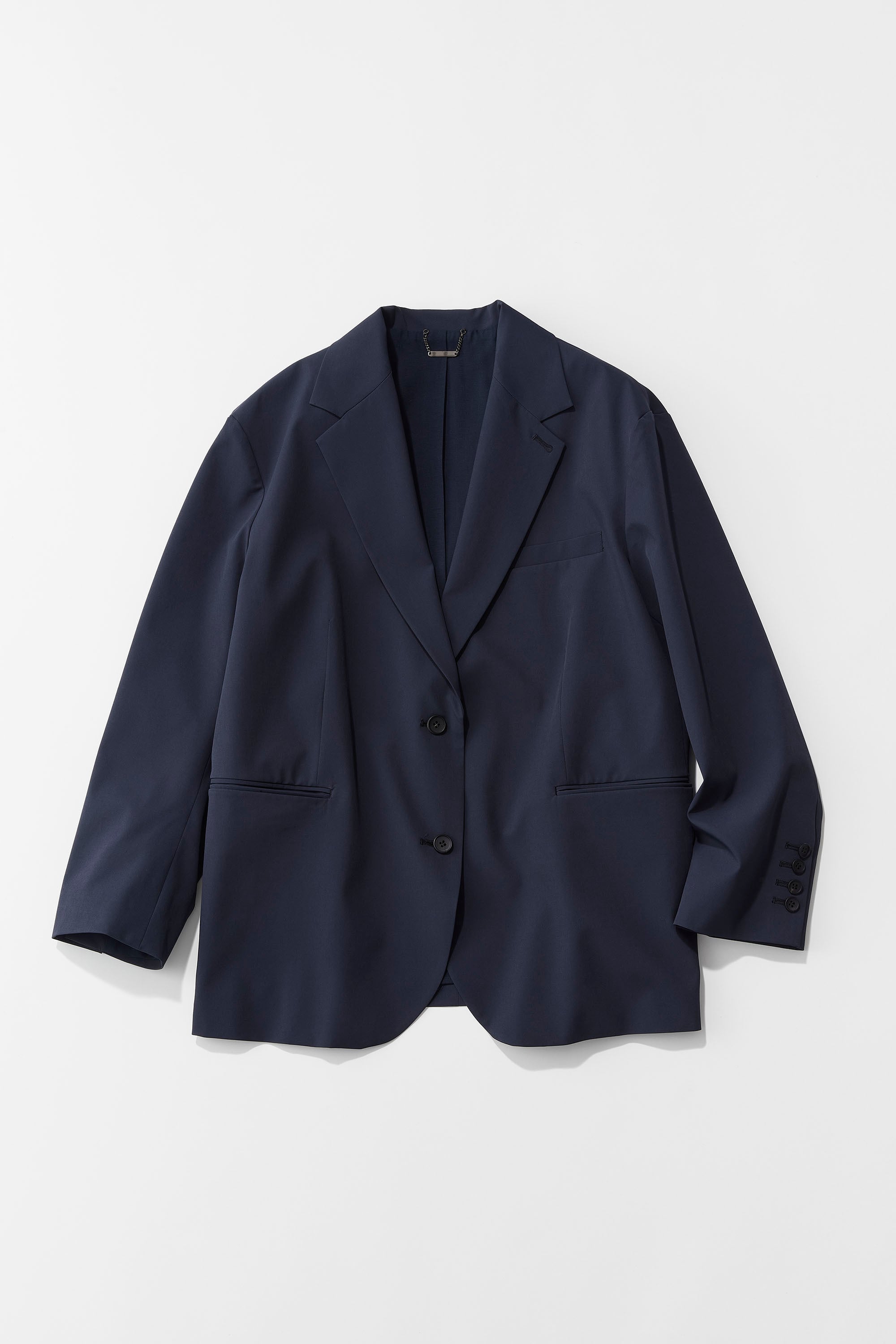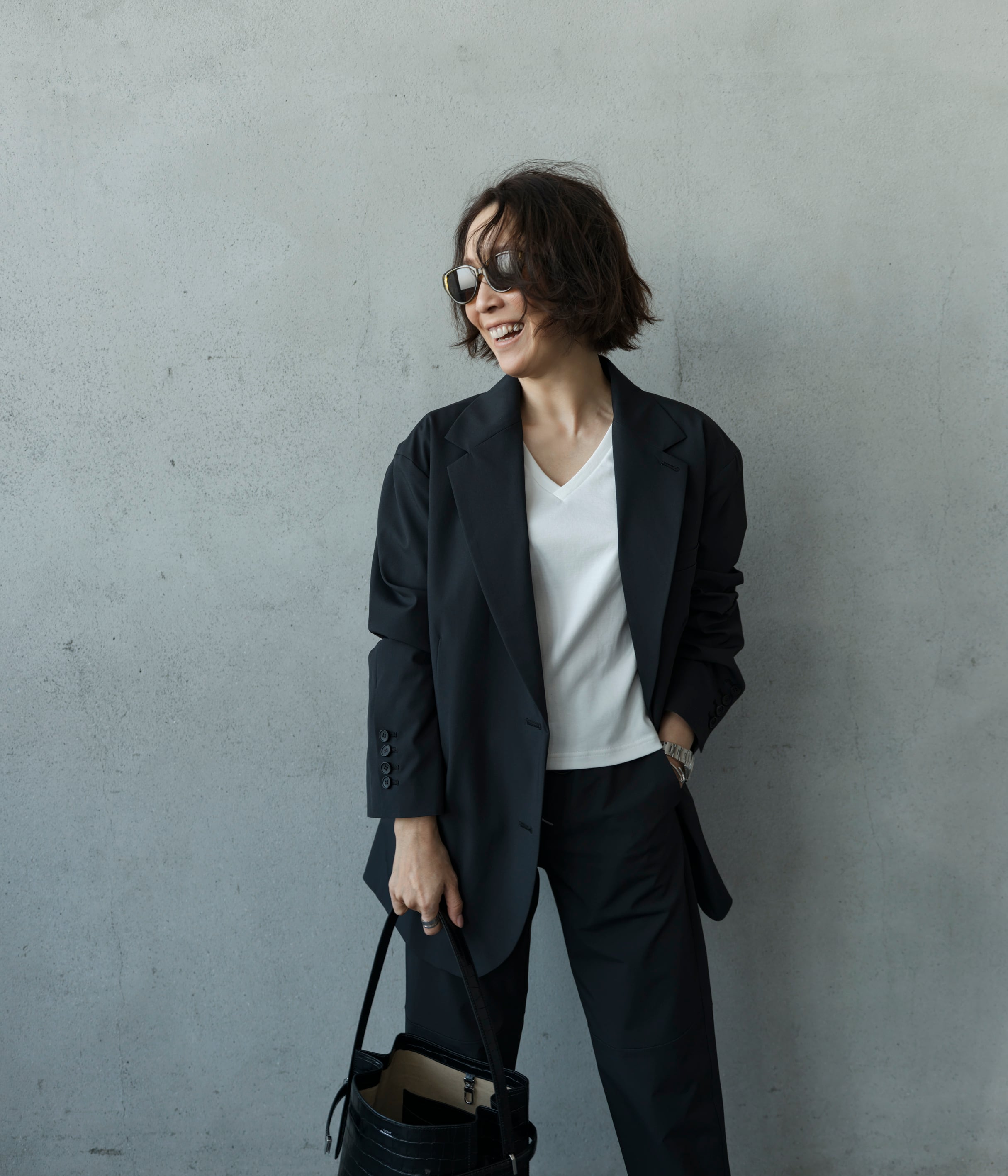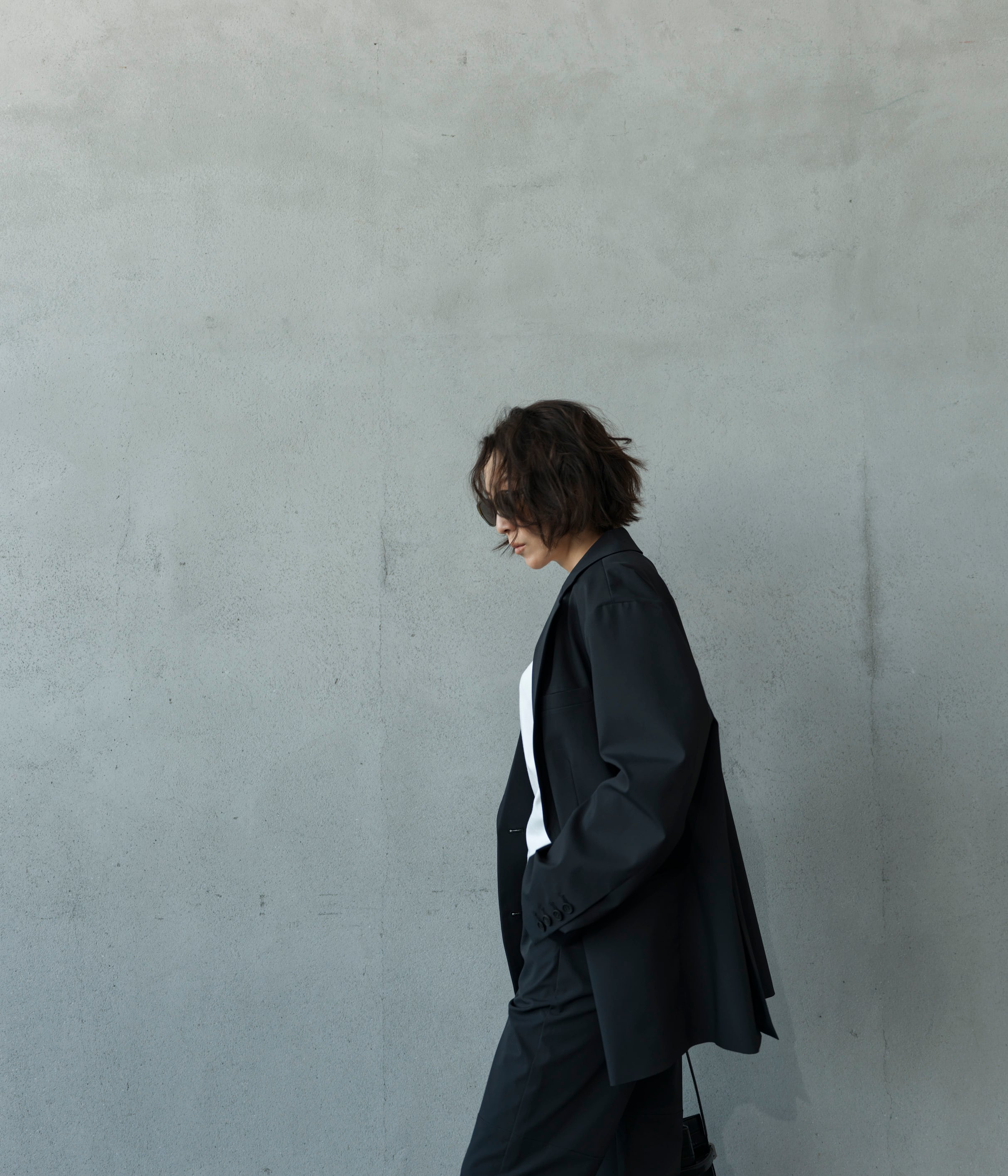 機能的には、2WAYストレッチ、接触冷感、UVカット、撥水、ウォッシャブルという多機能のお素材でお作りしているので、春コート代わりとしても、雨の日のアウターとしても大活躍するはず。ジャケットという見た目ですが、ビッグシルエットでカジュアルなファッションと合わせたり、ワンピースの上に羽織ったり、同素材でお作りしたパンツと合わせてセットアップで綺麗めに着ることも可能です。